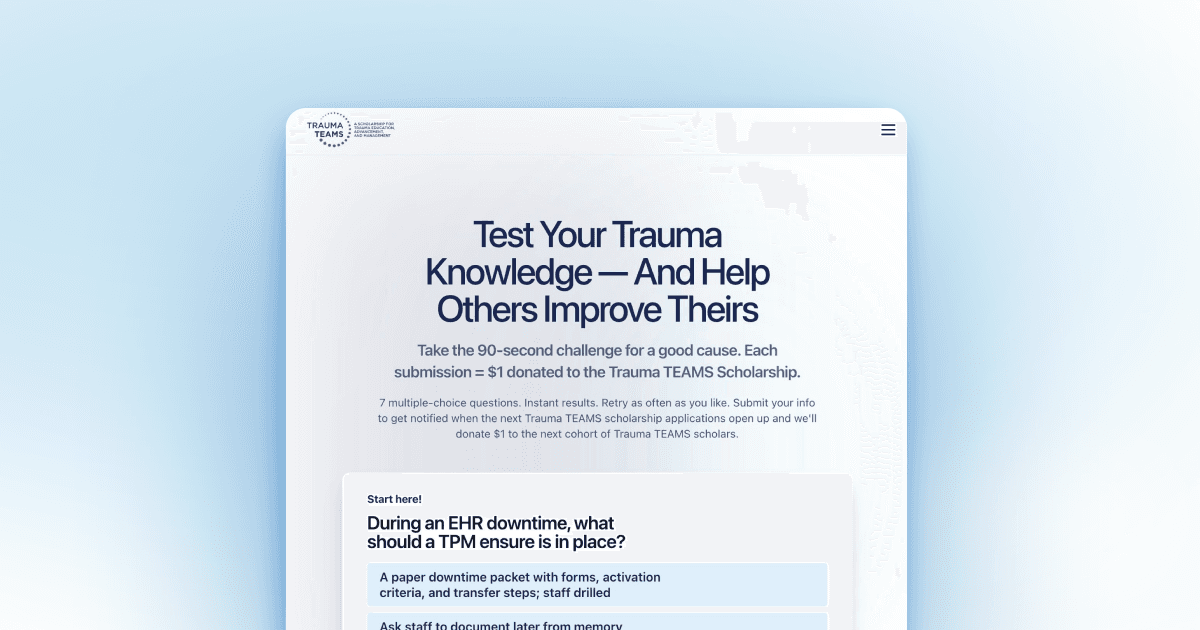 Start with the trauma iq — quick, fun, and every play helps fund future trauma leaders through the TEAMS Scholarship.